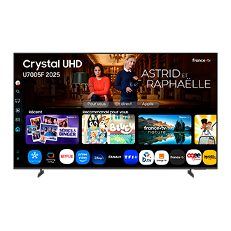 Le contenu et les services sont susceptibles d'être modifiés sans préavis. L'acceptation des conditions générales du Smart Hub et de la politique de confidentialité est requise avant l'utilisation. Certains contenus et services nécessitent une inscription et un abonnement. Nécessite un compte Samsung. Les mises à niveau de Tizen OS seront prises en charge pendant 7 ans à partir de 2025, pour les produits commercialisés en 2025. Veuillez noter que cette mise à niveau ne couvre pas les performances, les fonctionnalités ou la durabilité du matériel.Le meilleur de la TV. Gratuitement.