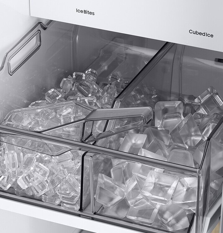Grâce au nouveau système de double fabrique de glace, rafraîchissez vos boissons et impressionnez vos invités : deux fois plus de glaçons (cubes et morceaux) dans un tiroir coulissant permettant un service facile. Vous pourrez obtenir jusqu’à 2,3 kg de glace par jour et en stocker jusqu’à 3,8 kg.