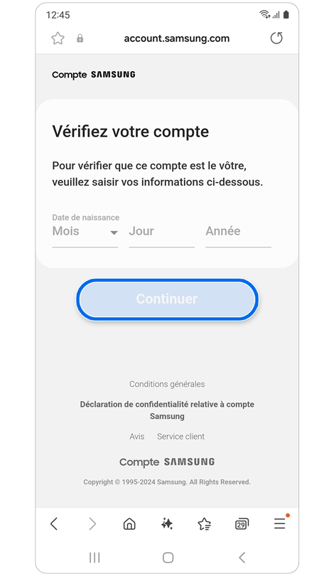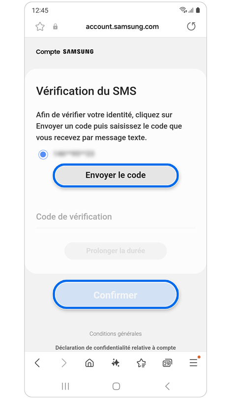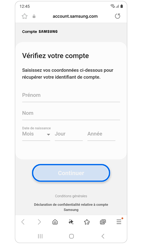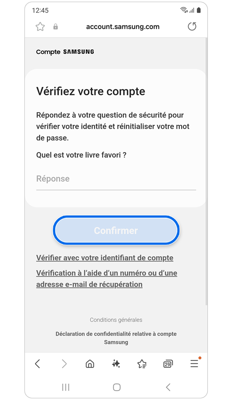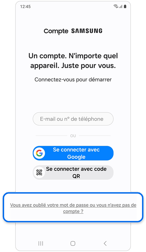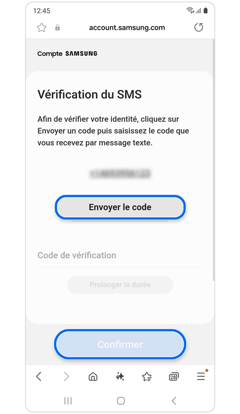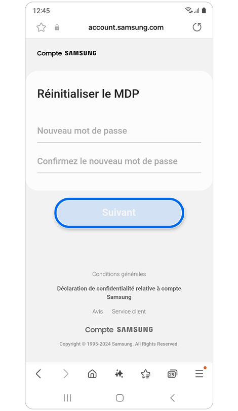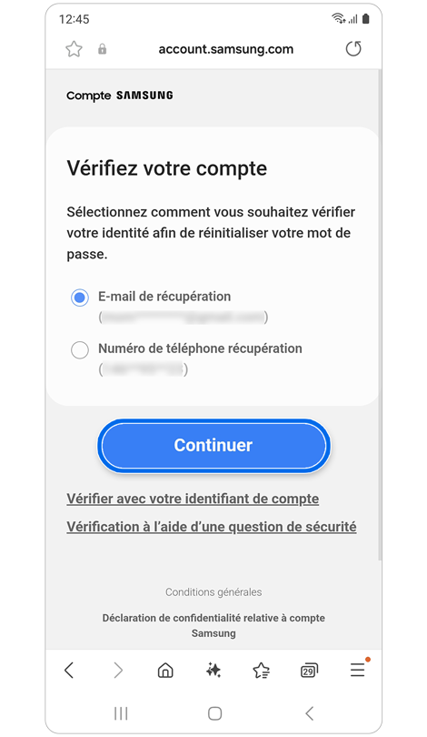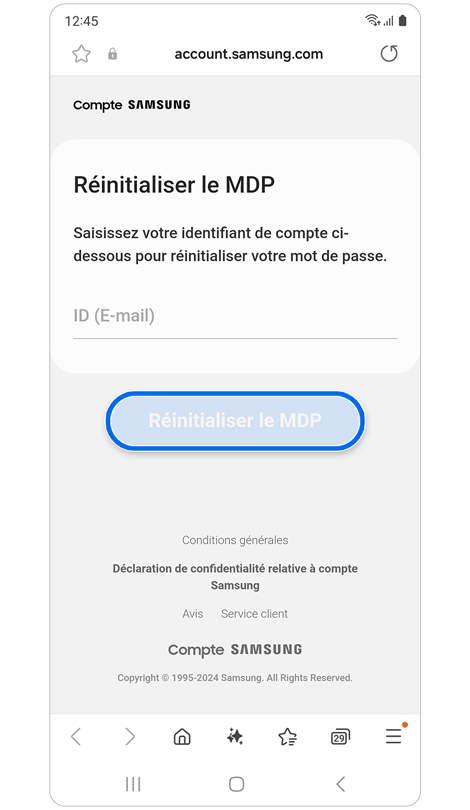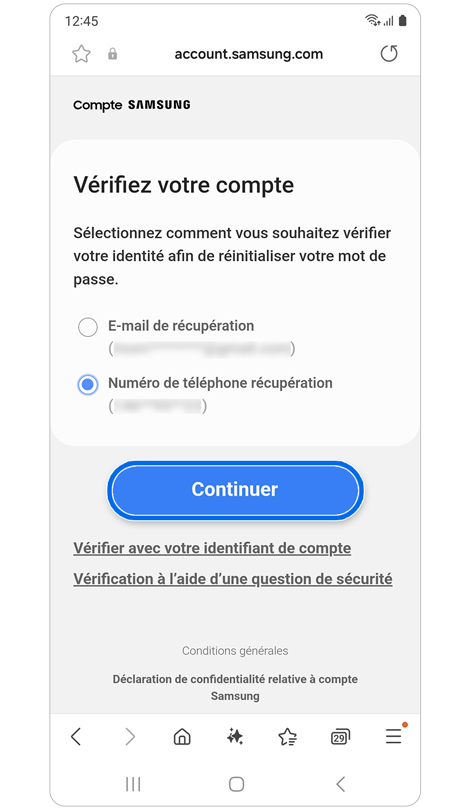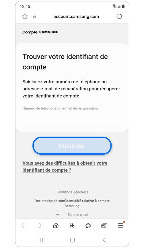 * La réinitialisation de votre mot de passe avec un numéro de téléphone de récupération nécessite l'enregistrement préalable de ce numéro dans les paramètres de votre compte Samsung.