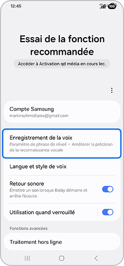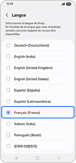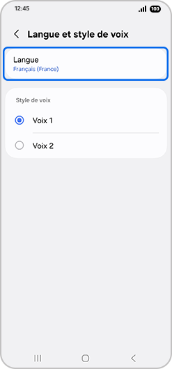 Remarque : Sur certains modèles de smartphone Galaxy antérieurs, une étape supplémentaire vous permettra de sélectionner la voix souhaitée. Sinon, cette option est disponible dans le menu Langue et style de voix des paramètres de Bixby.