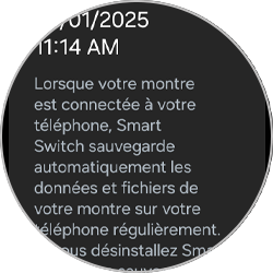 Si vous réinitialisez votre montre depuis les paramètres de celle-ci ou via l'application Galaxy Wearable installée sur votre smartphone, une sauvegarde automatique de vos données sera effectuée juste avant la réinitialisation. Cela garantit que vous pourrez restaurer vos données ultérieurement
