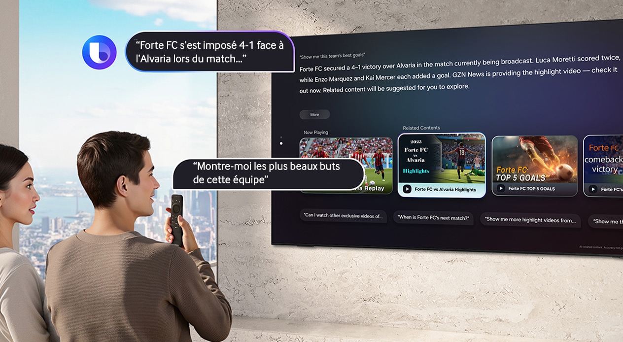 *Image simulée à des fins d'illustration. Toute modification de l'apparence et des spécifications de conception n'affectant pas les performances du produit peut intervenir sans préavis. L'interface utilisateur, le contenu et les services peuvent varier d'une région à l'autre et sont susceptibles d'être modifiés sans préavis. - Bixby : disponible sur la TNT, le câble et Samsung TV Plus.Les commandes vocales Bixby reconnaissent l’anglais (US/UK), le français, l’espagnol, l’allemand, l’italien, le chinois et le coréen. Tous les accents, dialectes et expressions ne sont pas reconnus. Les détails des acteurs sont fournis à partir des métadonnées associées au contenu visionné. Cette fonction fournit du contenu généré par l’IA. Exactitude non garantie. Veuillez vérifier les résultats. Pour contrôler des appareils compatibles SmartThings avec Bixby, connectez d’abord les appareils à l’application SmartThings. Pour plus d’informations, consultez le site SmartThings (www.samsung.com/fr/smartthings/ ). Les images à l’écran sont simulées à des fins d’illustration. Les images ont été générées avec l’aide d’outils d’IA.