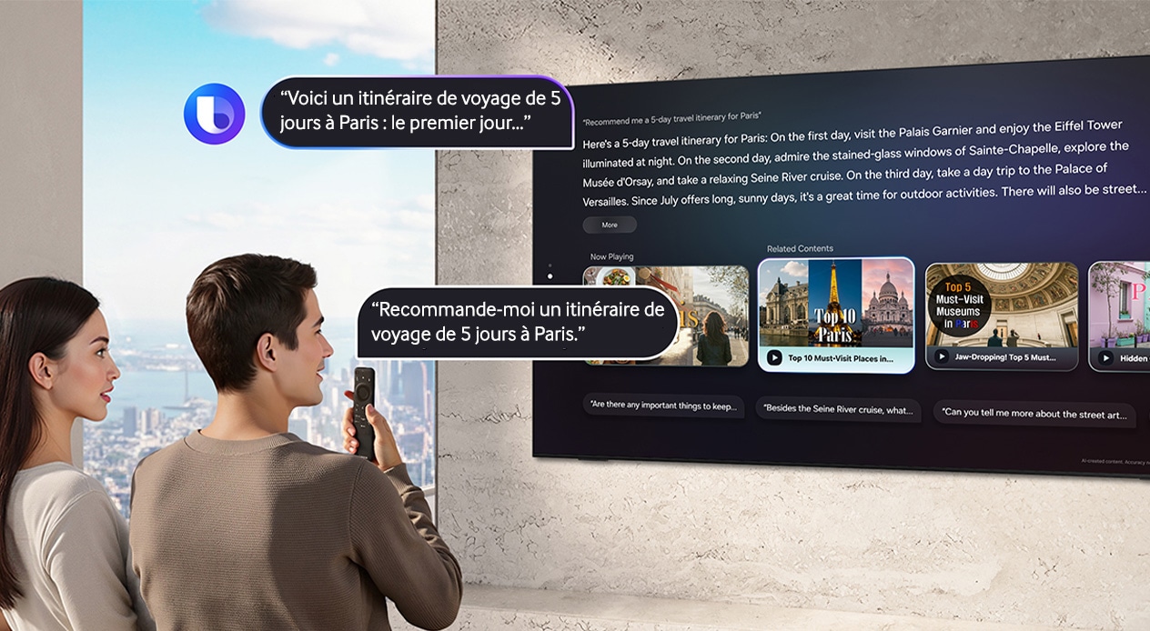 Dialoguez facilement avec Bixby, votre assistant vocal intelligent. Exprimez simplement ce que vous avez en tête. Que vous soyez curieux à propos d’un acteur, que vous cherchiez une nouvelle série à regarder ou que vous vouliez tamiser les lumières, votre téléviseur Samsung comprend et répond naturellement. Grâce à la compréhension contextuelle en temps réel, votre téléviseur vous répond avec des réponses pertinentes et intelligentes directement sur grand écran — sans saisie, sans menus, juste des conversations naturelles.2