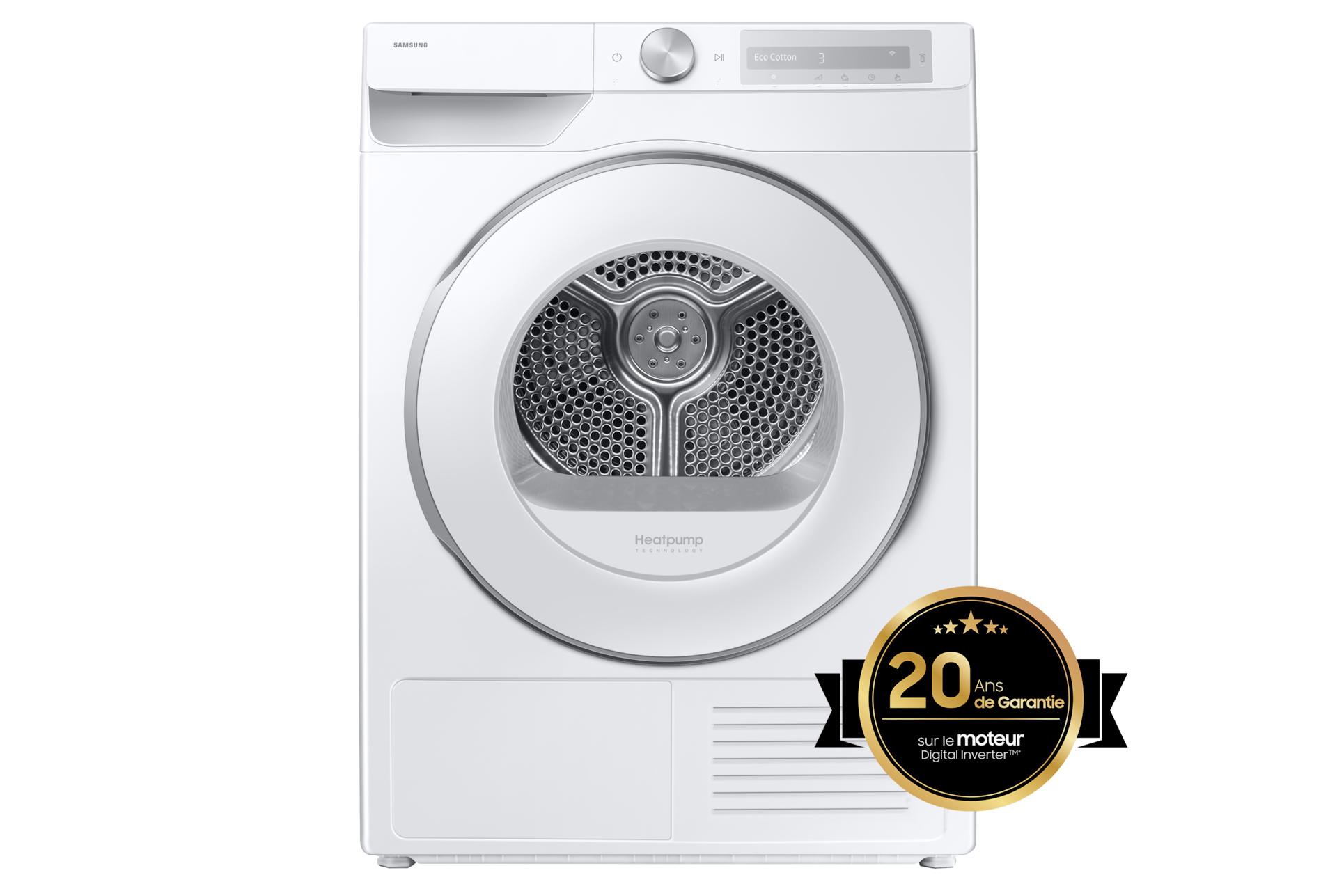 • 1. Testé conformément à la norme IEC 61121:2013, charge de lavage de 9 kg / coton prêt à ranger avec pompe à chaleur (DV90F09F4SU2) vs. Un sèche-linge classique (DV90DG52A0ABEF). Les résultats peuvent varier en fonction des conditions d'utilisation réelles. Go to feature