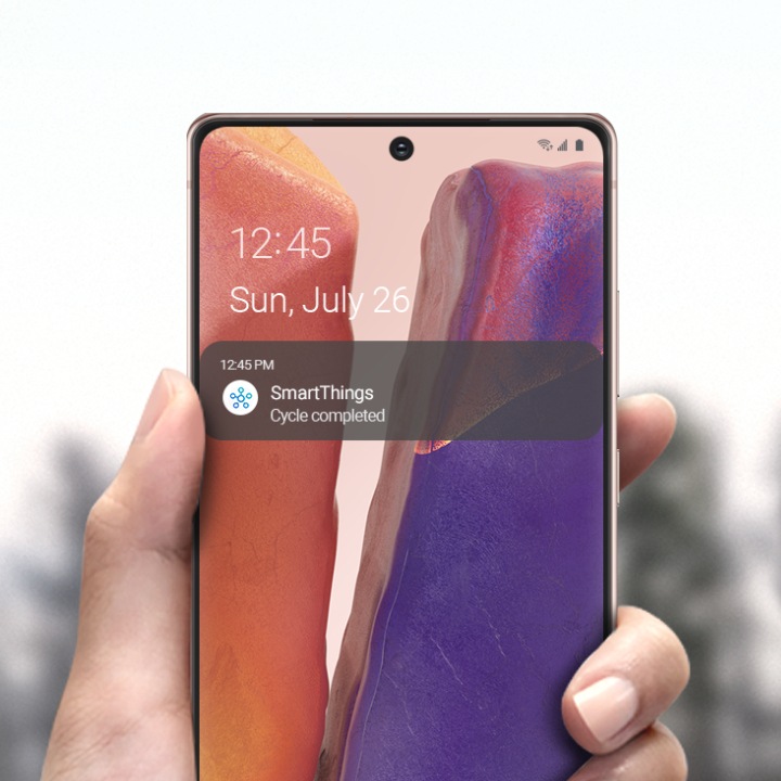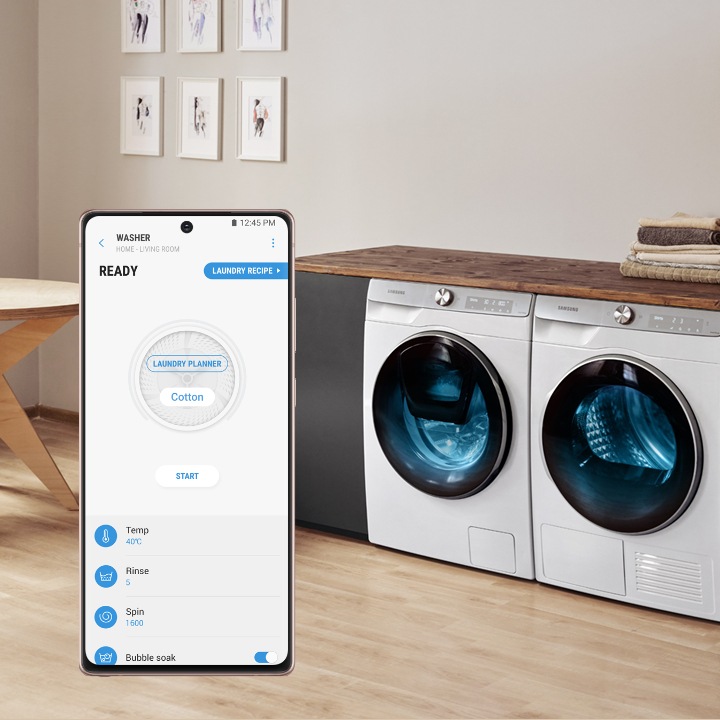 Il suffit d’utiliser l’application SmartThings pour synchroniser votre mobile Galaxy et votre nouveau lave-linge équipé de SmartThings.