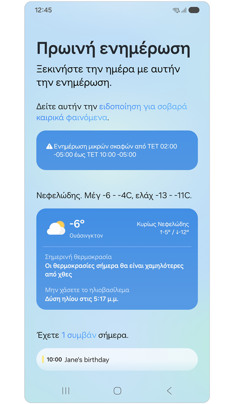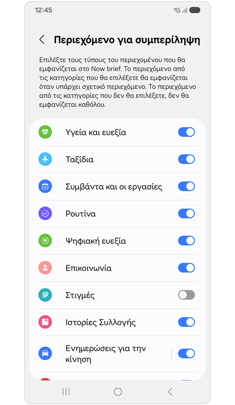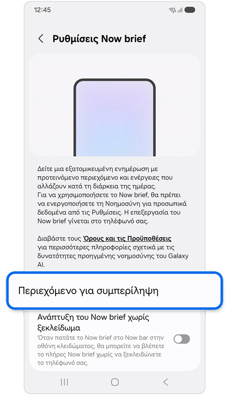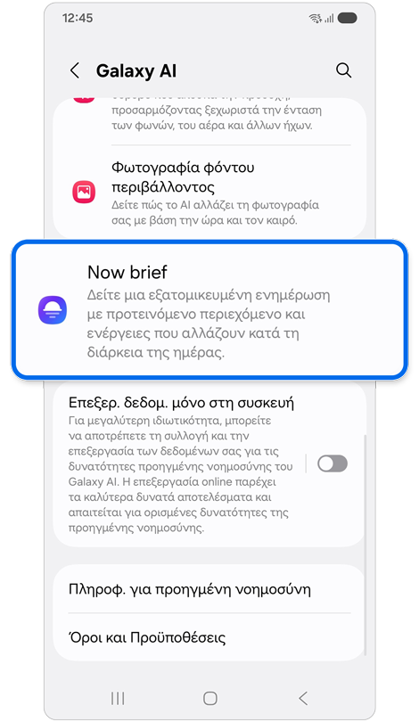 - Ορισμένες λειτουργίες ή λειτουργίες του Now brief ενδέχεται να διαφέρουν ανάλογα με τη συμπεριφορά του χρήστη, τις πληροφορίες της συσκευής, τη χώρα/τοποθεσία, την έκδοση λογισμικού και άλλους παράγοντες.