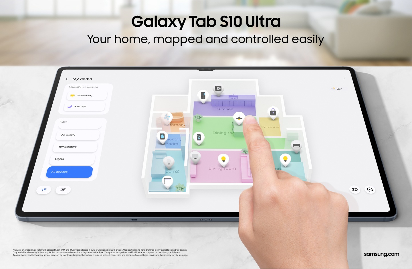 Galaxy Tab S10系列在處理效能上的升級讓用戶能夠更方便快捷地使用各種AI功能,各種創新軟件如筆記助手及繪圖助手等經調整後能夠更適合於平板電腦上使用。Galaxy Tab S10 系列還可作為家庭 AI 裝置,透過3D地圖功能檢視家中所有已連接的裝置,更方便地管理各種SmartThings生態中的智能裝置。強大的Samsung Knox亦確保數據私隱受到保護及控制,而創新材料的使用進一步支持Samsung對於可持續未來的承諾。