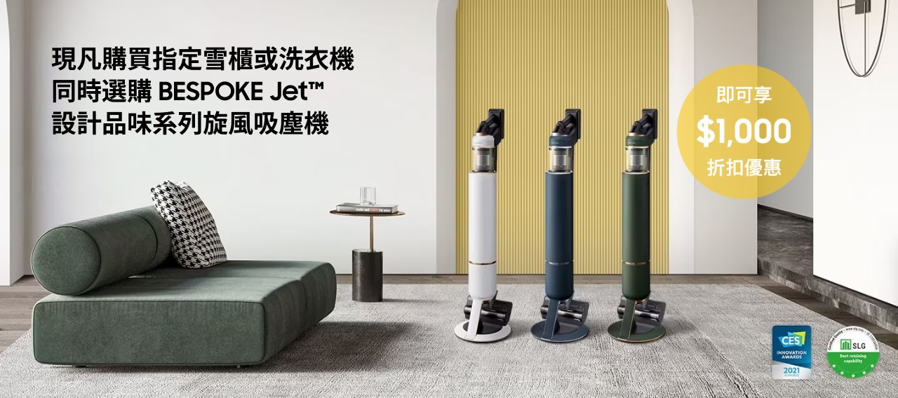 - 參加者於香港及澳門合資格零售商或經銷商或三星網上商店購買指定型號之雪櫃或AI Ecobubble™️ 智能洗衣機系列 或 AI 智能魔衣櫥 ,同時加購 BESPOKE Jet™️ 設計品味系列旋風吸塵機一部 (以上所列產品統稱為「指定產品」) ,即符合參加本推廣的資格 (「合資格客戶」) 。