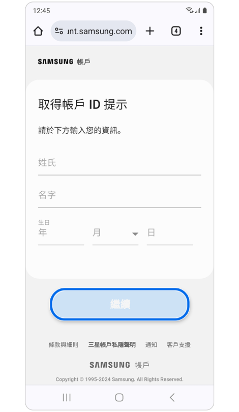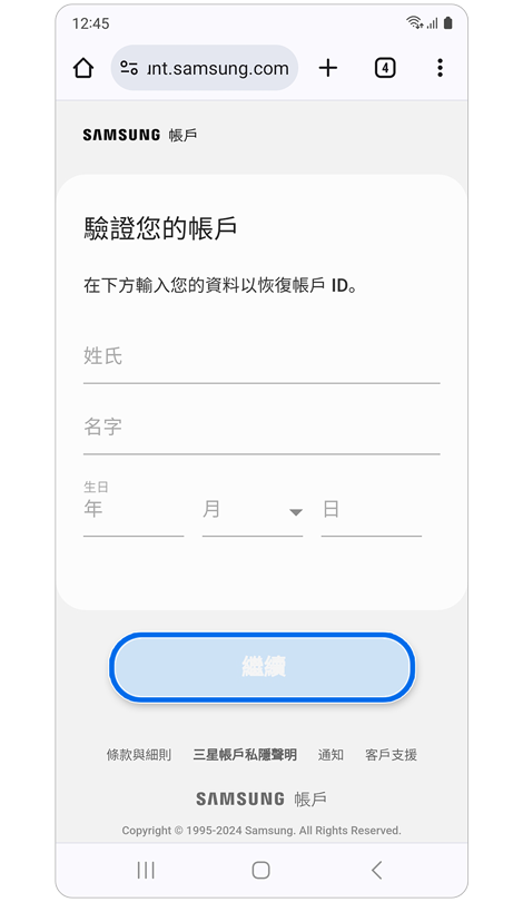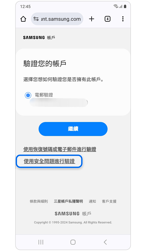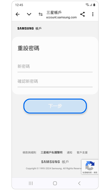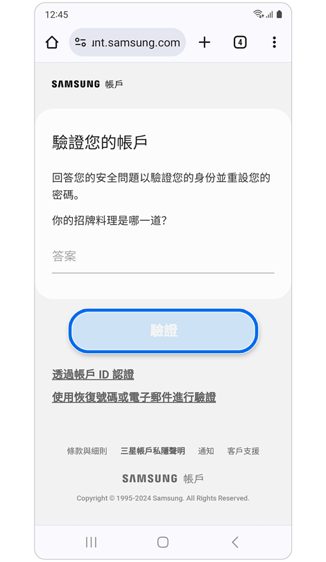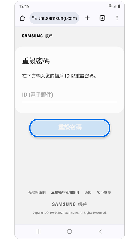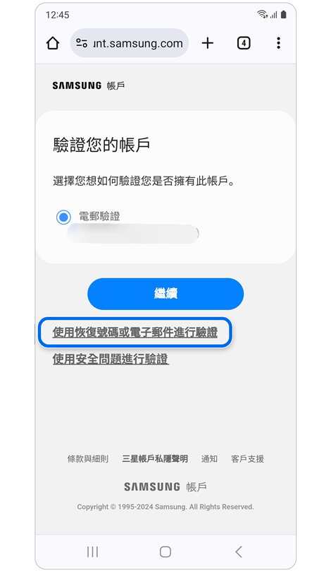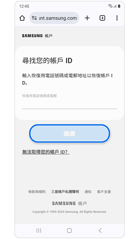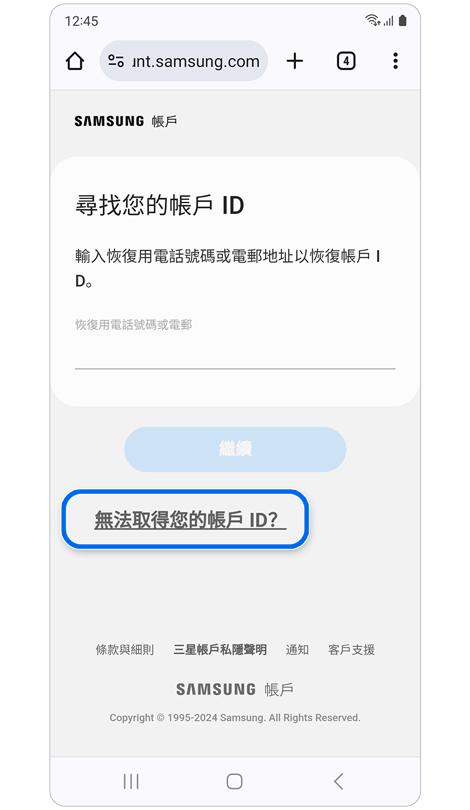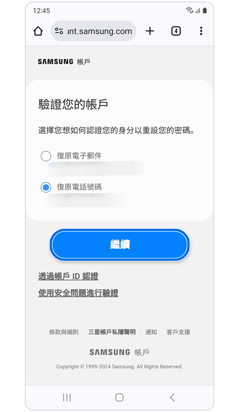 * 若要使用恢復電話號碼重設密碼,您必須已在三星帳戶設定中註冊恢復電話號碼。