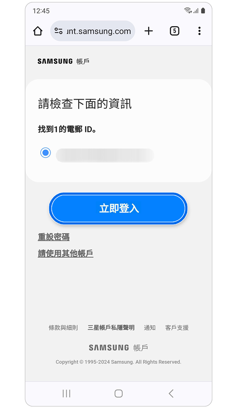 三星帳戶可協助您使用特定的應用程式和服務,例如 Samsung Pass 和 Samsung Find,以及將資料備份到三星雲端。如果您忘記了帳戶憑證,您可以恢復您的三星帳戶 ID 或重設密碼以重新存取您的帳戶。
