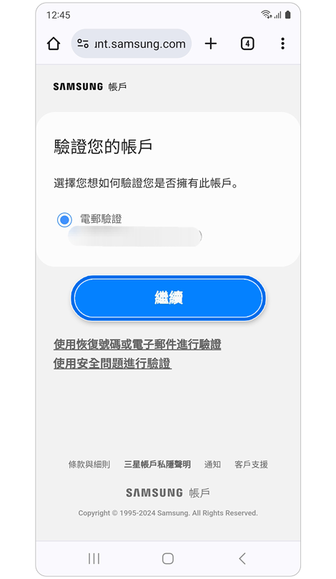 * 若要使用恢復電子郵件重設密碼,您必須先在三星帳戶設定中註冊恢復電子郵件。