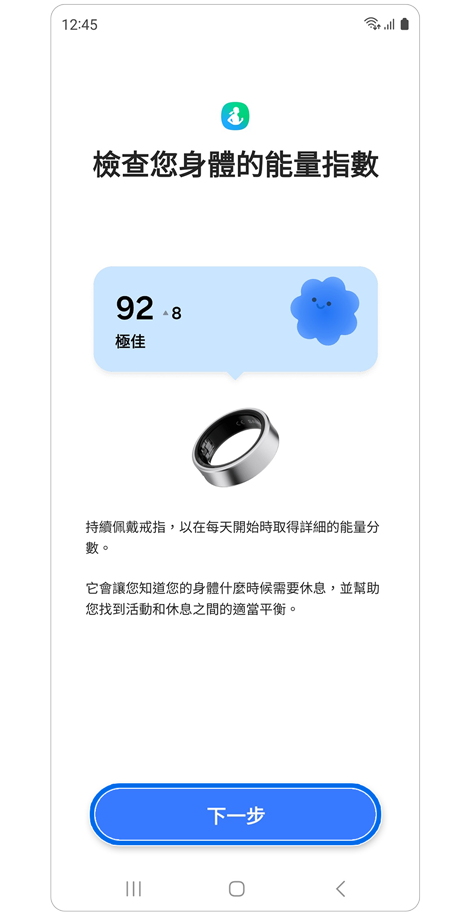 根據 Galaxy Ring 測量的心率、活動量和睡眠數據進行綜合分析,檢查您的能量得分,從而獲得健康平衡的生活指導。