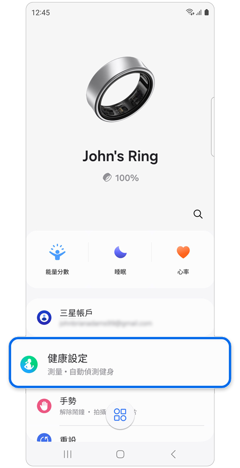 您可以使用 Galaxy Wearable 應用程式檢查戒指的狀態,例如連接狀態或剩餘電池電量以及測量的健康數據。