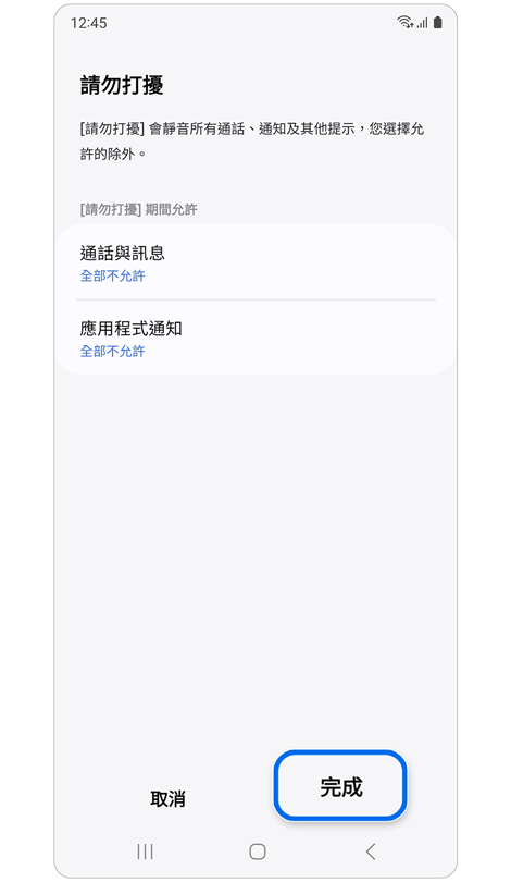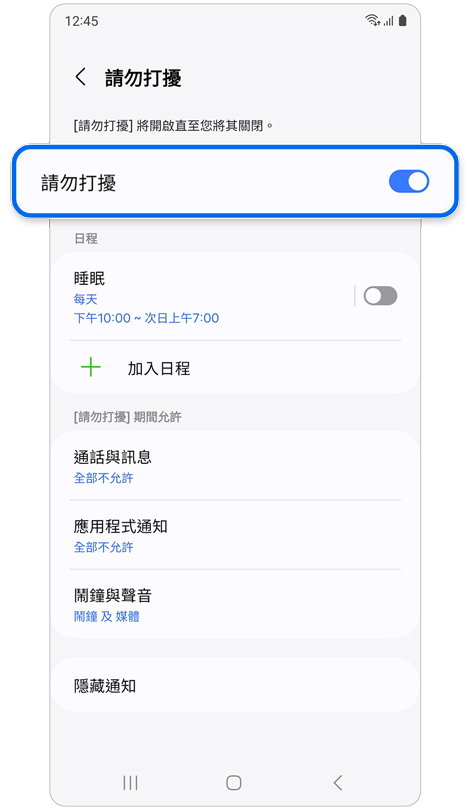 開啟手機設定 > 選擇通知 > 選擇請勿打擾 > 點按請勿打擾開關以開啟或關閉功能。