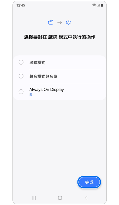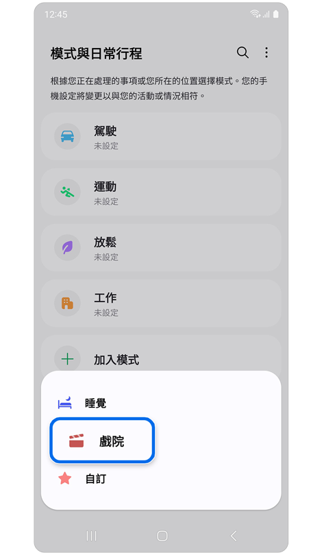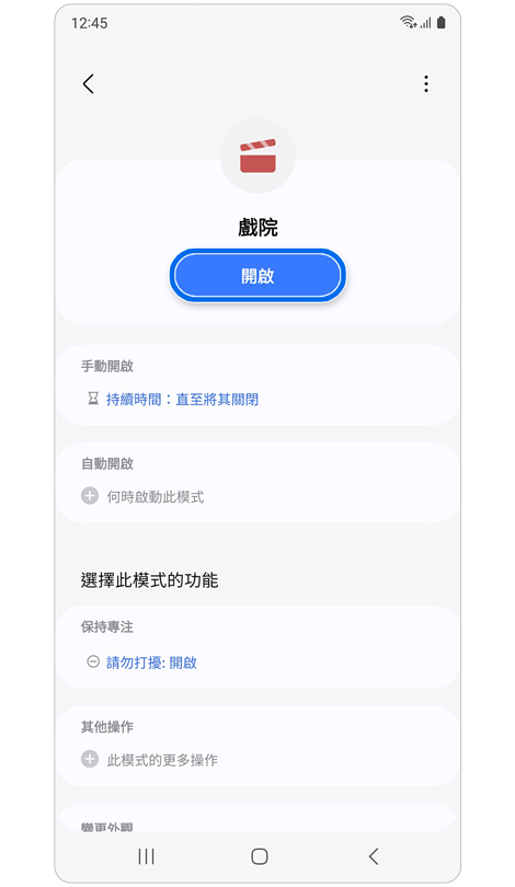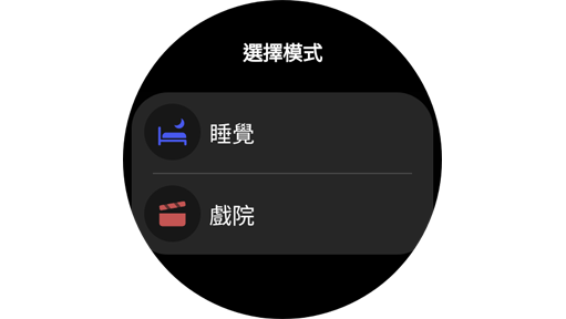 開啟或關閉模式:開啟 Galaxy Wearable 應用程式 > 選擇手錶設定 > 選擇模式 > 點選模式與日常行程 > 點選戲院圖示