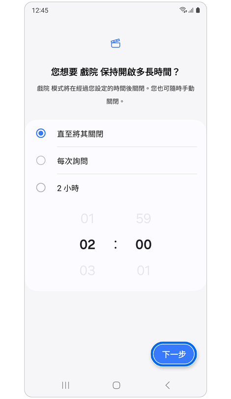 戲院模式可將通知提醒、音量和螢幕亮度調整為您的預設值,這樣您在觀看電影時就不會分心。