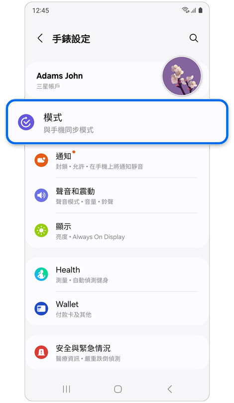 開啟Galaxy Wearable 應用程式 > 選擇手錶設定 > 選擇模式 > 點選模式與日常行程 > 點選睡覺圖示開啟或關閉模式