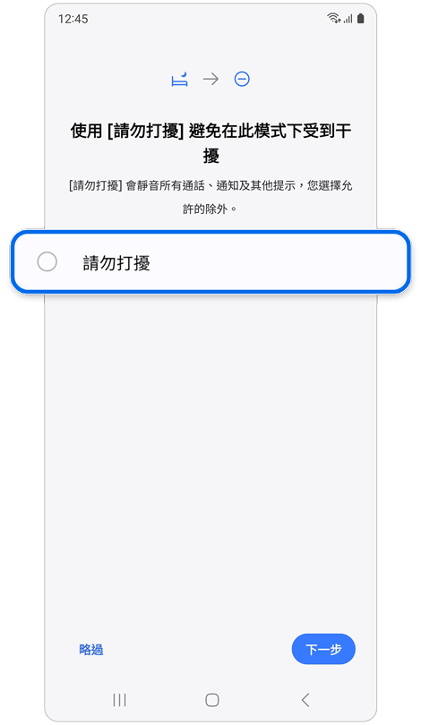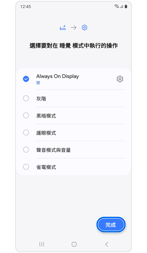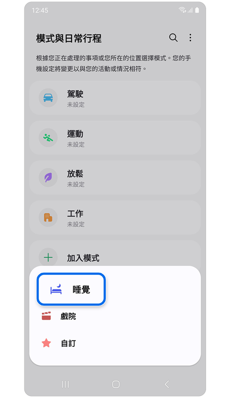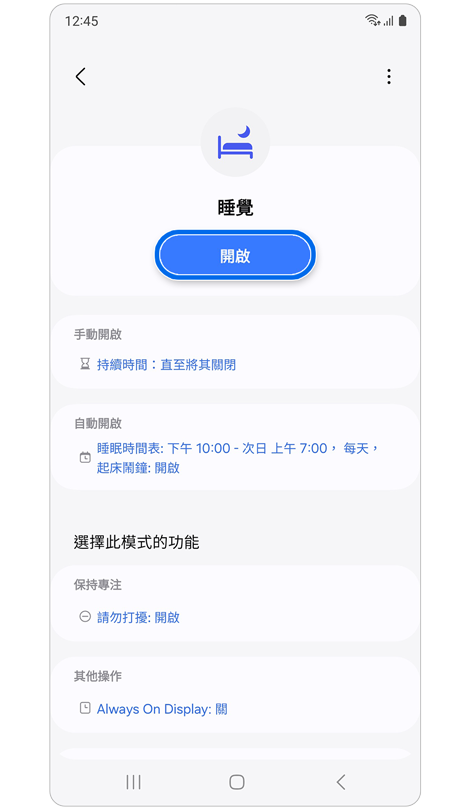 開啟該模式:向下滑動以存取快速設定 > 點選模式圖示 > 選擇睡覺