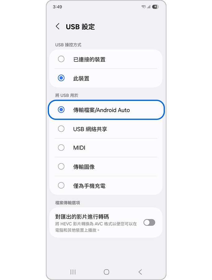 如果您的手機已連接但仍無法辨識,問題可能是由目前的 USB 使用設定所導致。在某些模式下 (例如僅充電),電腦可能只顯示裝置名稱或完全不顯示資料夾。若要傳輸檔案,請將 USB 使用模式改為傳輸檔案這樣就可以從 PC 存取內部儲存空間。
