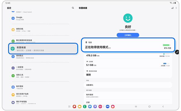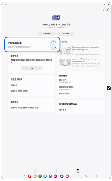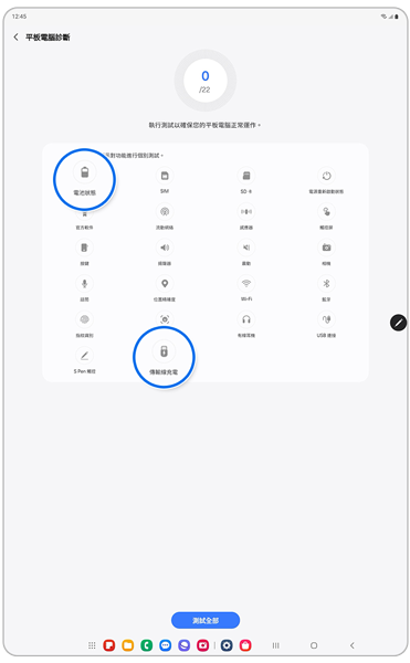 您可以使用 Samsung Members 對電池和充電連接口進行測試。