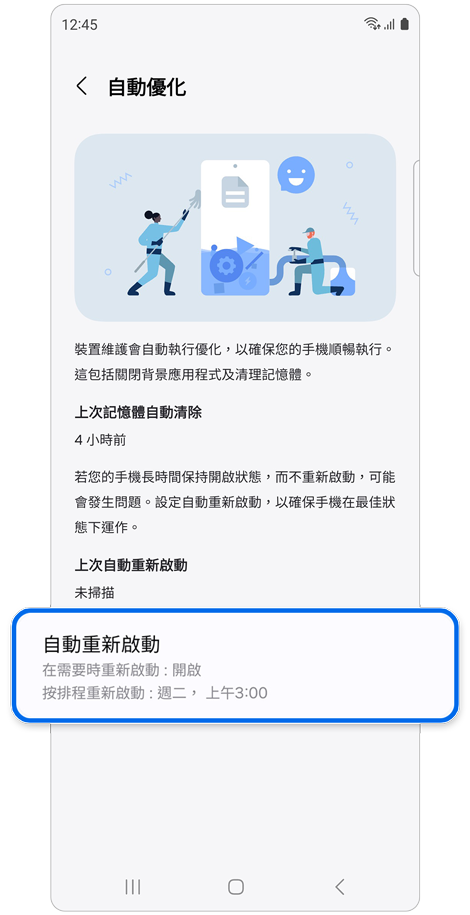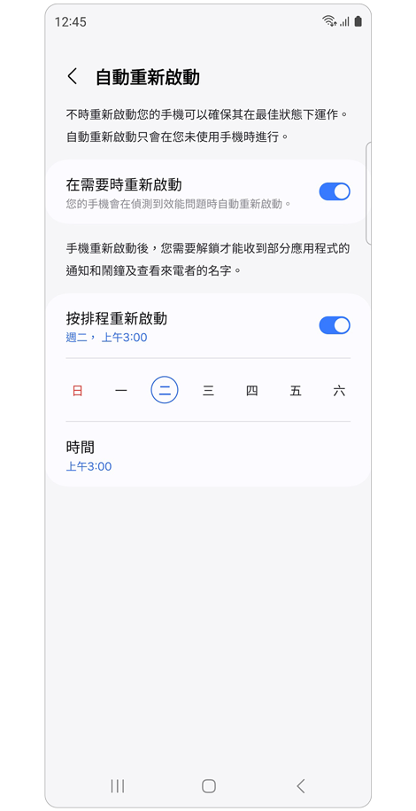 - 在需要時重新啟動:當偵測到效能問題時,您的手機將自動重新啟動。