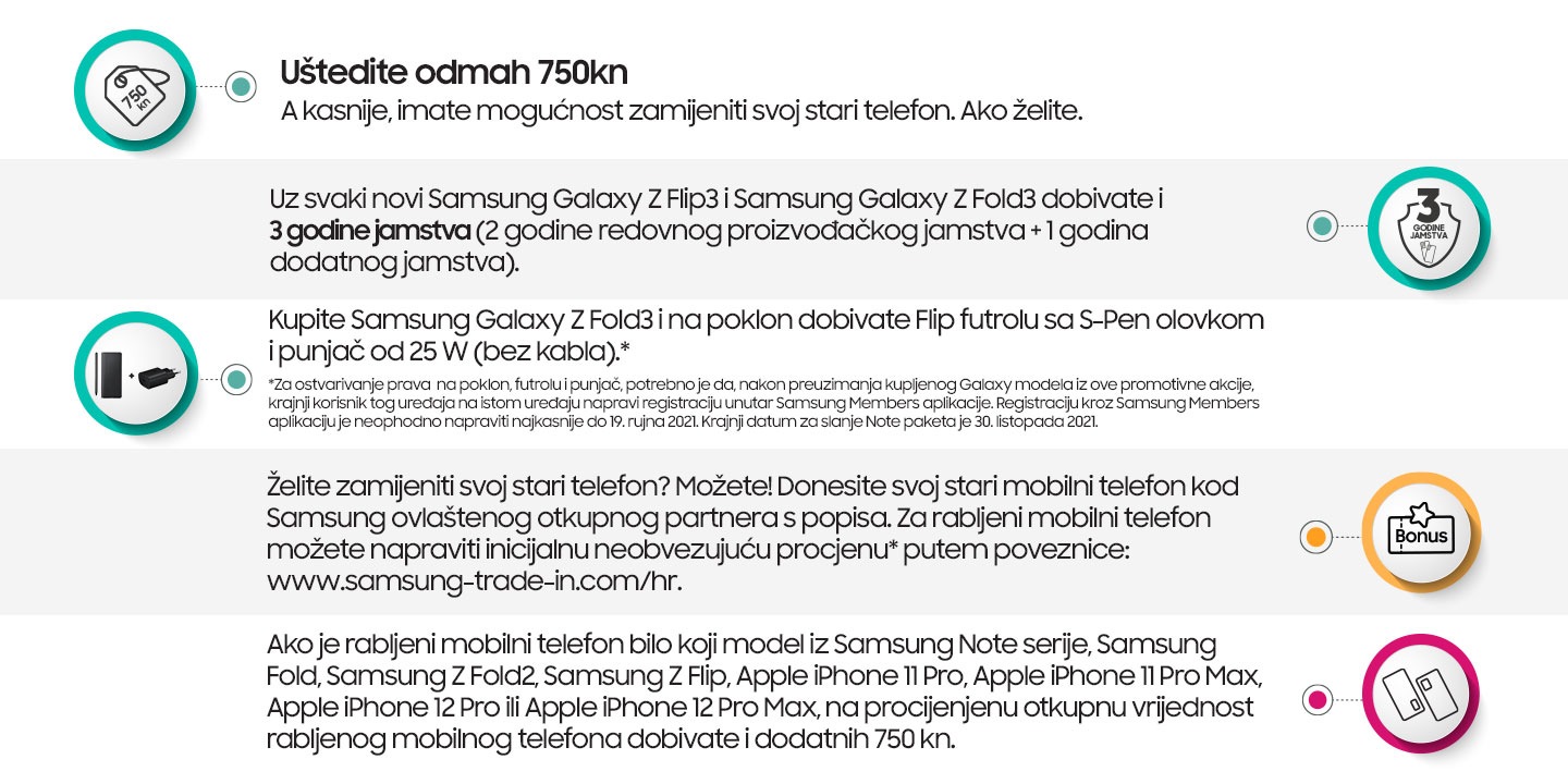 * Ukupna vrijednost pogodnosti ovisi o procijenjenoj vrijednosti starog mobitela prema važećem cjeniku Samsung otkupnog partnera na dan procjene i otkupa starog mobitela i prema verziji novog modela telefona koji se kupuje.