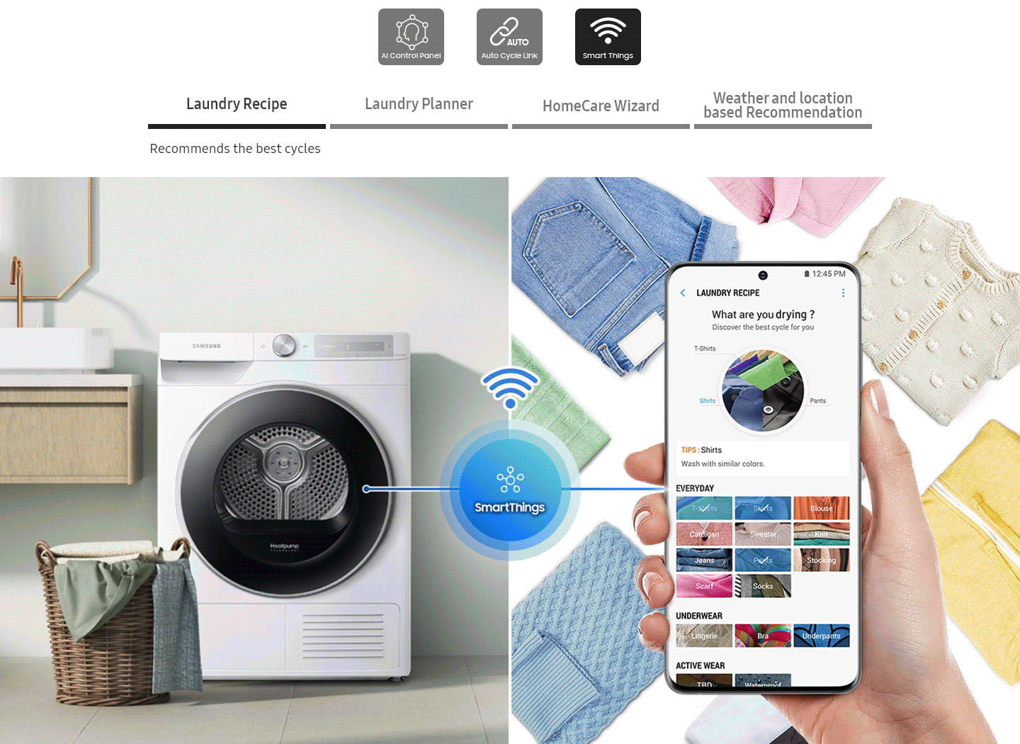 - * Dostupno samo na pojedinim modelima uređaja.** Dostupno na uređajima koji podržavaju Android i iOS operativne sustave. Potrebni su Wi-Fi veza i Samsung račun.*** Automatsko povezivanje ciklusa dostupno je samo u slučaju kada su i perilica i sušilica opremljene AI Control tehnologijom i povezane na istu Wi-Fi bežičnu mrežu.※Slike grafičkoga korisničkog sučelja na mobilnom uređaju mogu se razlikovati ovisno o državi, okružju itd.