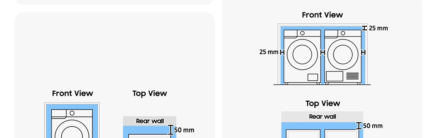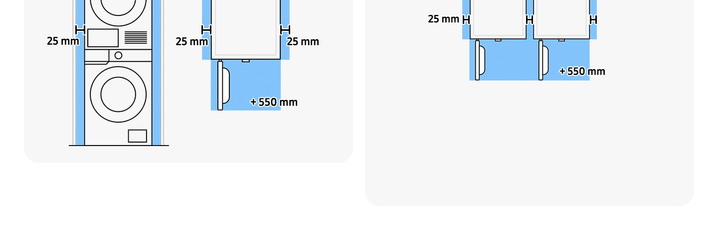 Egy nagy mosó- és szárítógép egymás mellé helyezésén gondolkodsz? Vedd figyelembe a szélességi méreteket! Legyen elegendő hely, legalább 550 mm az ajtók teljes kinyitásához. Ezenkívül 25 mm-es résnek kell lennie a falak között, valamint a készülékek között és fölött.