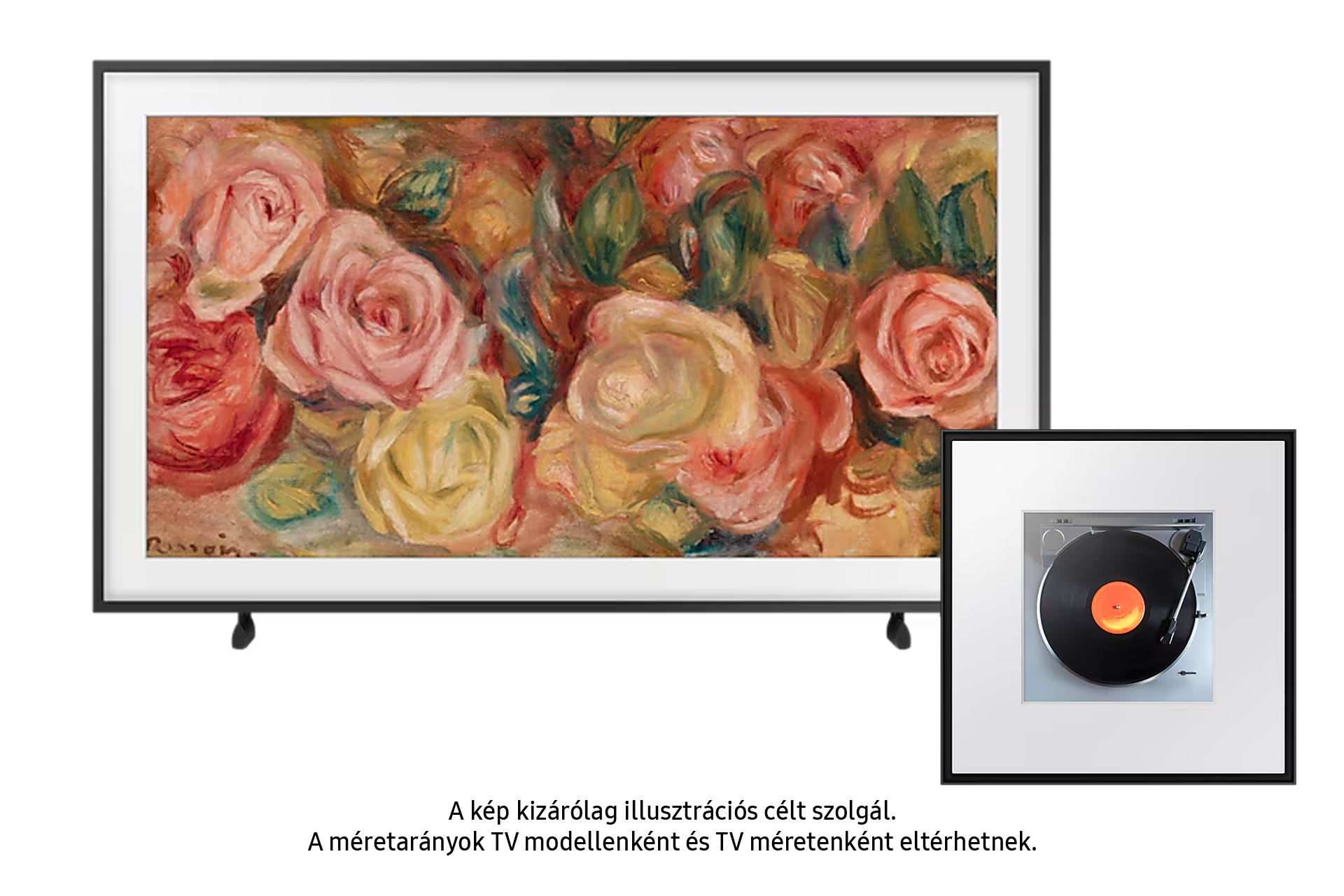 * Az Automatikusan forgó állvány csak a 43~55" colos képernyőméretekhez érhető el.* Az Automatikusan forgó állvány külön vásárolható meg.* A The Frame keretén kívül más tartozékot nem szabad csatlakoztatni (pl. webkamera stb.)* Az Automatikusan forgó állvány csak a megadott bizonyos méretű modellekre telepíthető. A kompatibilitás listája a specifikációkban található.* A képek illusztrációk.