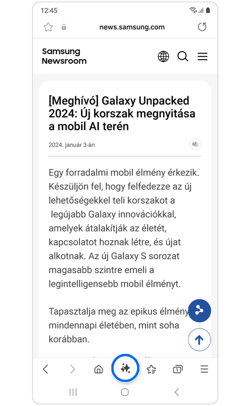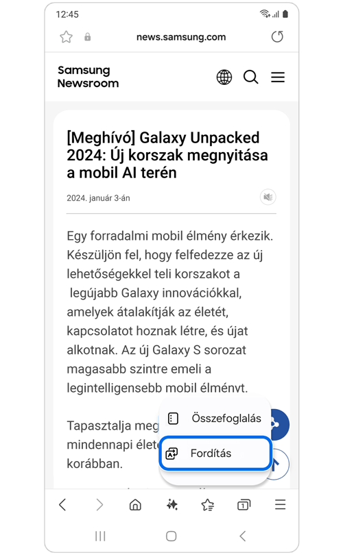 A Böngészési segéd a Samsung Internet alkalmazás része, és összefoglaló és fordítási funkciókat tartalmaz, amelyekkel időt takaríthatsz meg és kényelmesebbé teszik az internetes böngészést. Használja a Böngészés segédet a Galaxy AI-val, hogy összefoglalja vagy lefordítsa a cikkeket egy weboldalról.