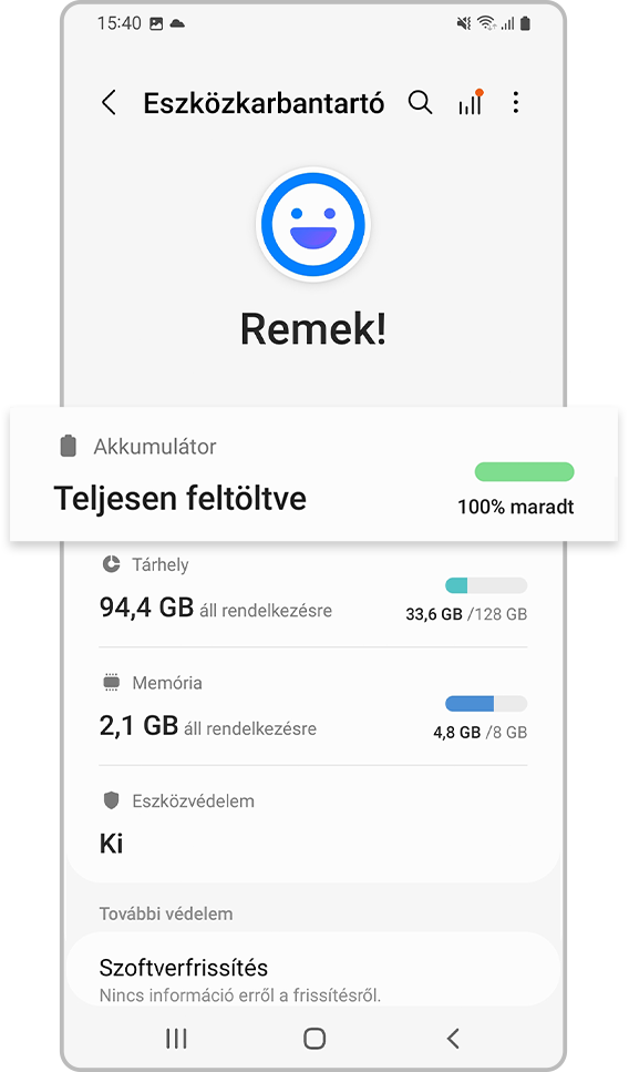 A szupergyors töltés kizárólag bizonyos telefonok esetében áll rendelkezésre. Ehhez töltőt és 25 W-os vagy 45 W-os eredeti Samsung adaptert kell használnod.