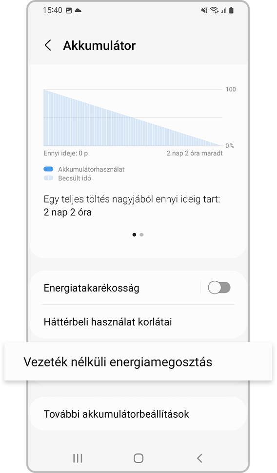 Egy másik eszközt is tölthetsz a telefon akkumulátoráról. A Vezeték nélküli energiamegosztás funkcióval a telefonod vezeték nélkül képes tölteni egy másik Galaxy telefont, Galaxy órát vagy Galaxy fülhallgatókat. Mindössze annyit kell tenned, hogy a két eszközt egymás mellé teszed. Tölthetsz egy másik eszközt miközben a saját telefonod is tölt. A Vezeték nélküli energiamegosztás funkció bekapcsolásához kövesd az alábbi lépéseket.