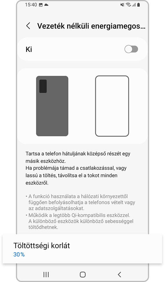 - Ezzel a funkcióval csak a vezeték nélküli töltést támogató eszközöket lehet tölteni.