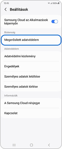 A megerősített adatvédelem funkció a Samsung biztonsági funkciója az értékes adatoknak tekintett személyes adatok védelmére. Ez a funkció lehetővé teszi az érzékeny adatok E2EE („végpontok közötti titkosítás”) technológiával történő tárolását a Samsung Cloudban.