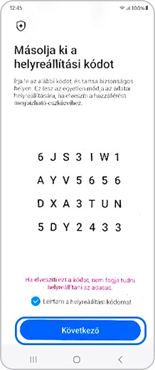 A helyreállítási kód a generálás után nem tekinthető meg újra, és a Samsung nem tárolja a helyreállítási kódokat. Amikor a helyreállítási kód létrejött, azt fel kell jegyezni, és biztonságos helyre el kell tenni.