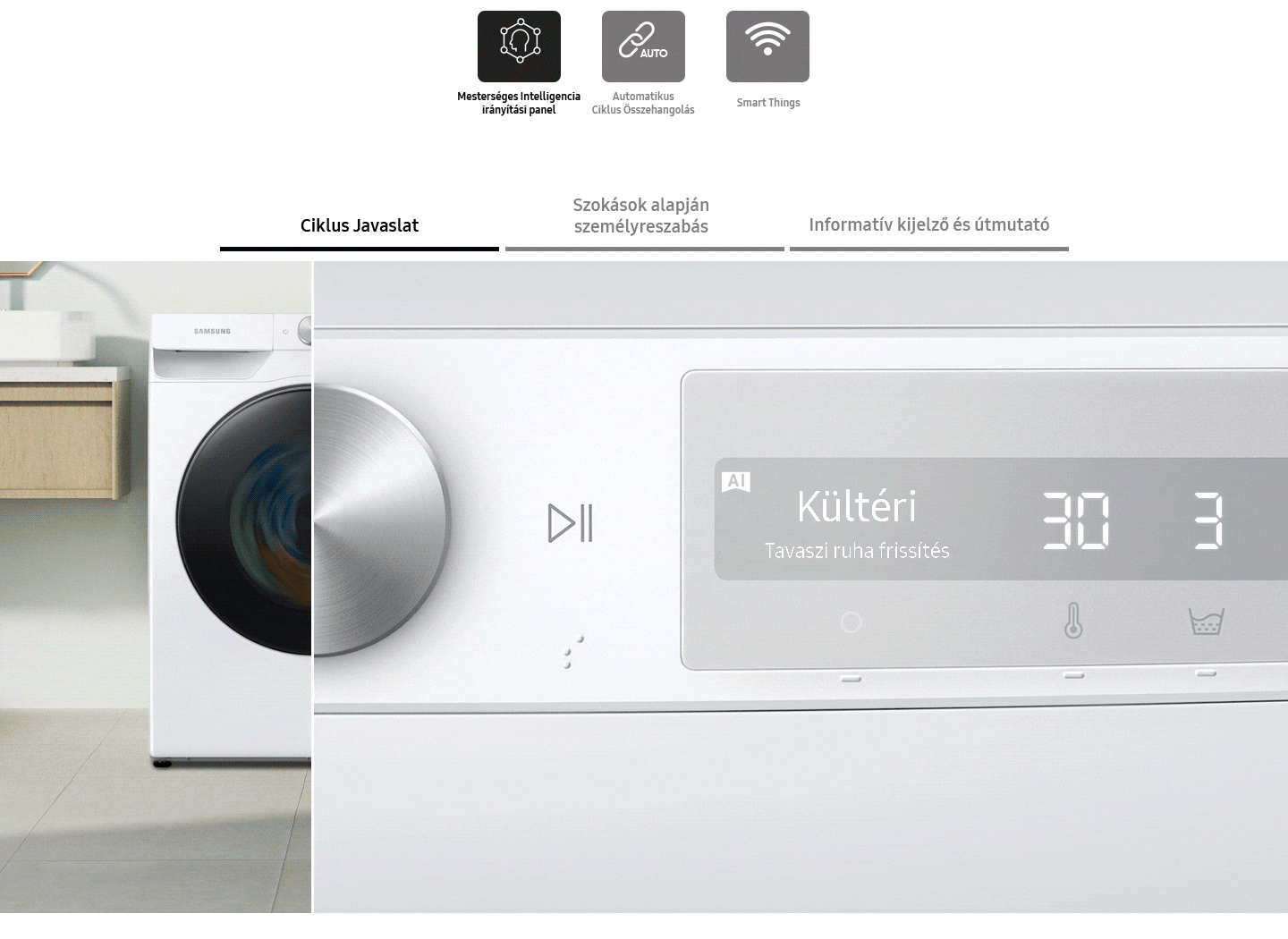 - *Android és iOS eszközökön érhető el. Wi-Fi csatlakozás és Samsung fiók ("Samsung Account") regisztráció szükséges hozzá. **Az Automatikus Ciklus Összehangolás kizárólag akkor érhető el, ha a mosógép és a szárítógép is rendelkezik AI-jal (Mesterséges Intelligenciával) és Wi-Fi kapcsolattal. ※A képek eltérhetnek a valós terméktől. ※A mobil grafikus felhasználói felület (angolul 'Graphical User Interface'; nemzetközileg ismert rövidítése: 'GUI') képei országonként és régiókként eltérhetnek.