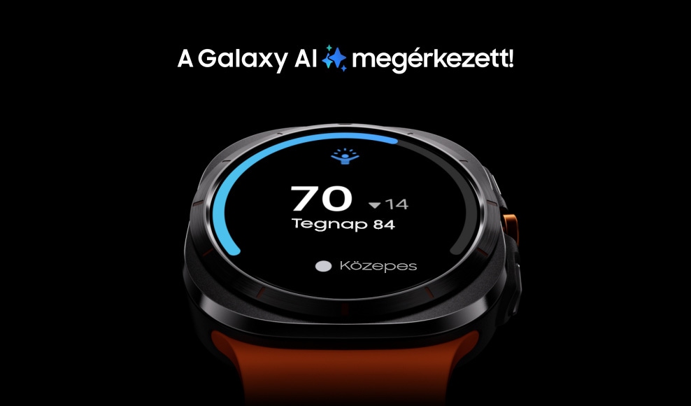 A Galaxy Watch Ultra felett egy „A Galaxy AI megérkezett!” szöveg látható. Ahogy az Energiaszint emelkedik a kijelzőn, és megáll "94"-nél, az óra körül különböző egészségügyi mutatókat tartalmazó kártyák jelennek meg.