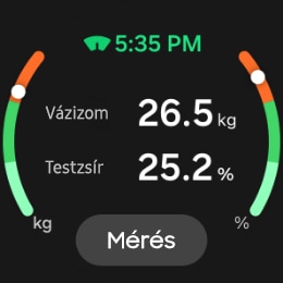 - A testösszetétel-mérés csak a Samsung Galaxy Watch4 szériás és a később kiadott Galaxy Watch modellekben támogatott. A testösszetétel-mérést nem szabad használni, pacemaker vagy más beültetett orvosi eszköz vagy terhesség esetén. Az eszközön és az alkalmazáson keresztül elért egészséggel kapcsolatos információk nem kezelhetők orvosi tanácsként. Előfordulhat, hogy a mérési eredmények nem pontosak 20 év alatti személyek mérése esetén. A mérési eredmények csak a személyes tájékoztatásodat szolgálják. Kérj tanácsot egy egészségügyi szakembertől!