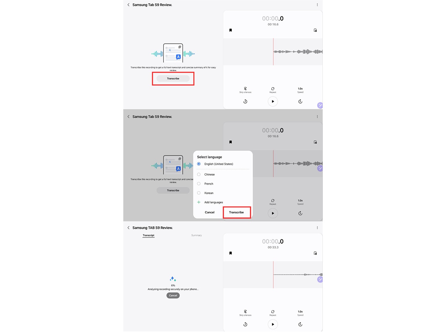 Maksimalkan fitur Translate jika diperlukan. Buka aplikasi Voice Recording, pilih rekaman Anda, klik Transcribe, pilih bahasa, dan selesai! Hasil transkrip dan ringkasan siap Anda pelajari kapan saja.