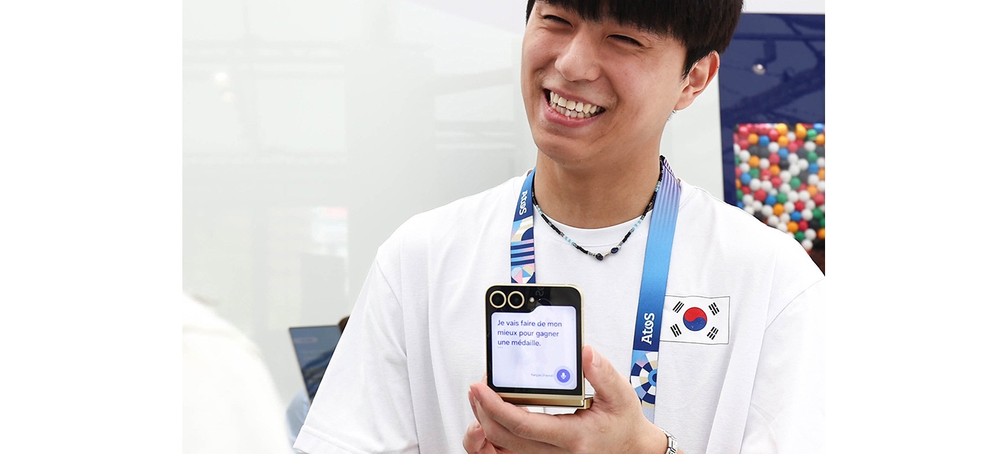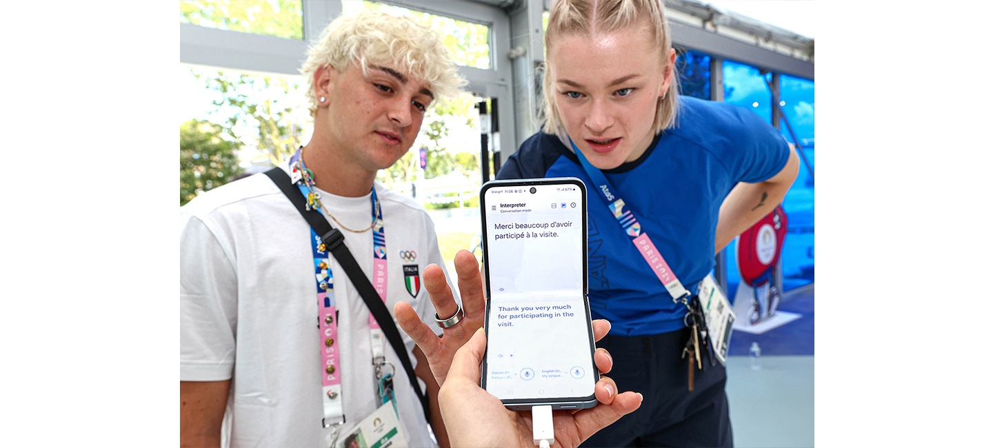 Ini yang istimewa saat Anda menggunakan Galaxy Z Flip6 dan Z Fold6. Anda bisa memanfaatkan AI Interpreter sambil menggunakan FlexMode. Cukup dengan mengetuk ikon Ubah mode tampilan untuk membalikkan setengah bagian atas layar menghadap lawan bicara > Ketuk ikon Mikrofon yang menghadap Anda dan bicaralah.