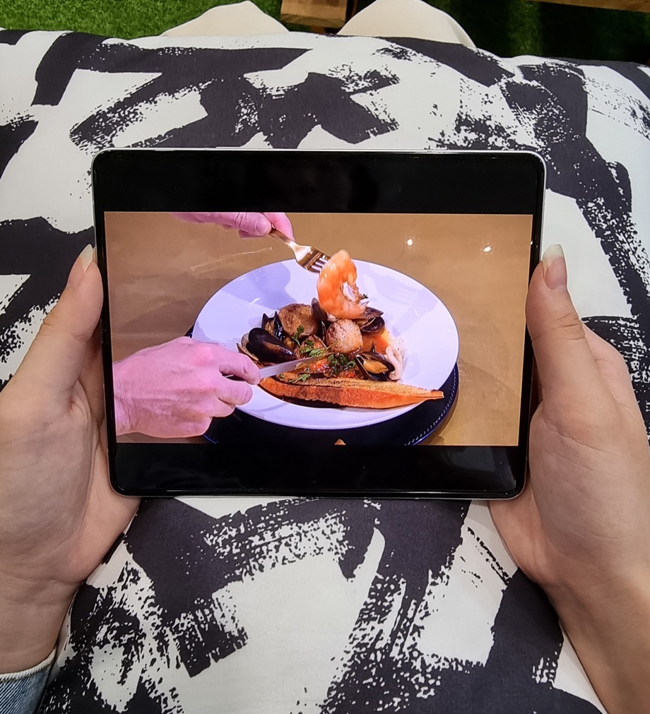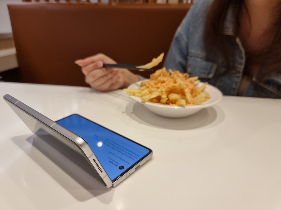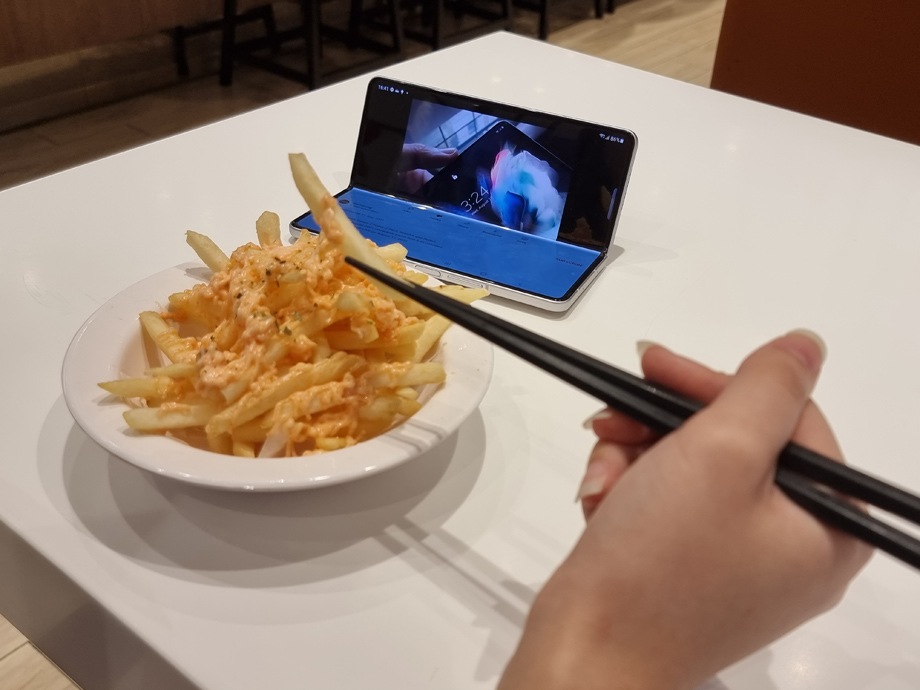 Dengan Galaxy Z Fold3, Anda tidak perlu lagi membawa tablet atau laptop Anda yang berat untuk menemani Anda menonton serial TV kesukaan Anda saat makan.
