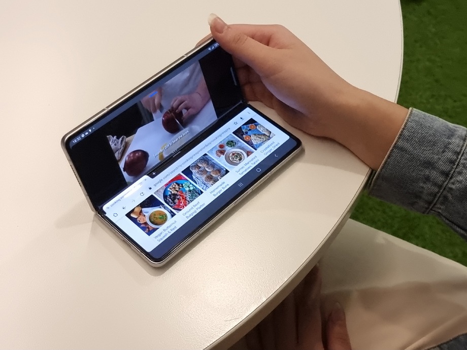 - Letakkan Galaxy Z Fold3 di permukaan datar dan buka menjadi bentuk L.