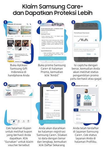 - Aktivasi kupon free Samsung Care+ dapat digunakan hingga 14 hari setelah pengambilan Promo. Jika konsumen tidak melakukan aktivasi sampai dengan 14 hari setelah pengambilan Promo, maka konsumen tidak akan mendapat benefit Samsung Care+.
