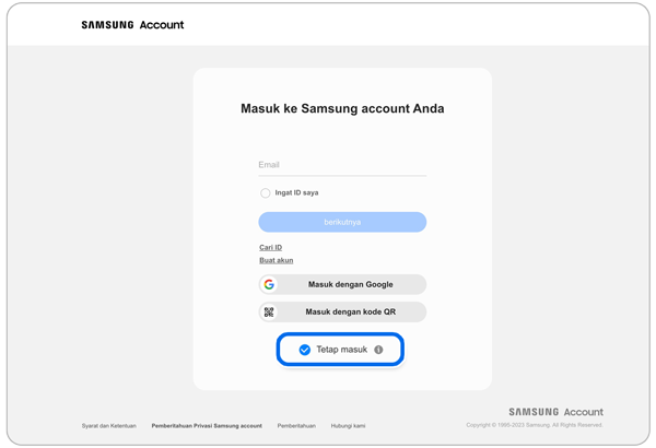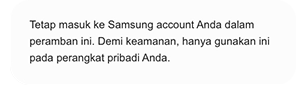 Catatan: Jika Anda tidak mengakses akun Samsung Anda lagi dalam waktu satu tahun setelah mengaktifkan "Tetap masuk", fitur tersebut akan secara otomatis dinonaktifkan.
