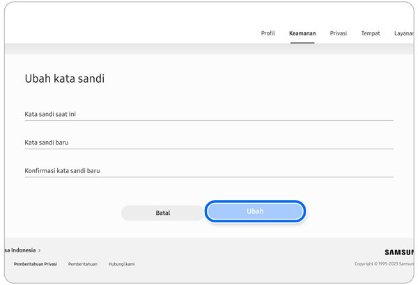 Sekali "Tetap masuk" diaktifkan, fitur ini akan tetap aktif selama satu tahun sejak Anda masuk ke akun Anda di Samsung.com. Periode waktu ini diperpanjang selama satu tahun tambahan setiap kali Anda mengakses akun Anda di situs web.