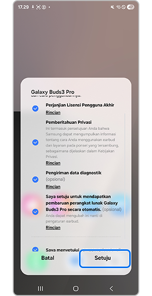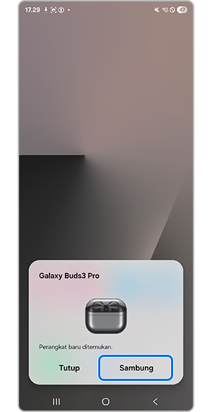 Catatan: Jika Pop-up QuickPair tidak muncul di layar, tekan dan tahan tombol sambung di bagian bawah casing earbud untuk memulai proses pemasangan dengan perangkat.