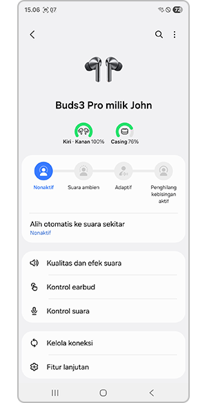 Menu Pengaturan menampilkan earbud yang tersambung dan memungkinkan Anda menyesuaikan fiturnya.