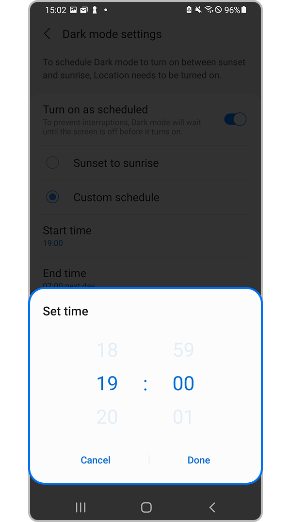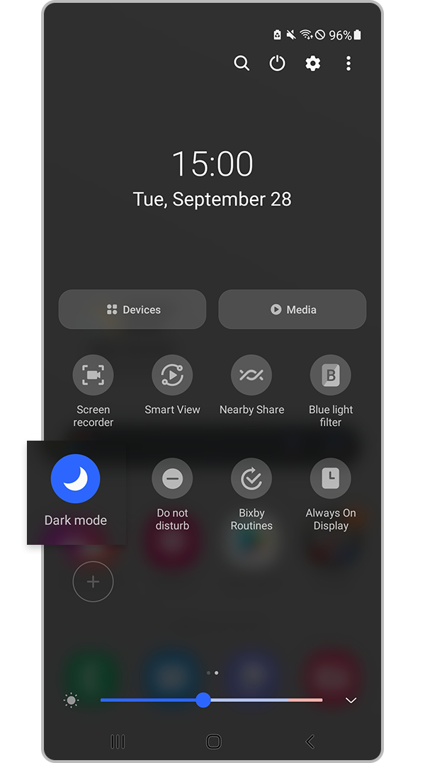 Anda dapat mengurangi ketegangan mata dengan menerapkan fitur Mode gelap saat menggunakan perangkat di malam hari atau di tempat gelap. Anda dapat mengatur jadwal untuk menerapkan Mode gelap. Ikuti langkah-langkah di bawah ini untuk mengaktifkan Mode gelap.