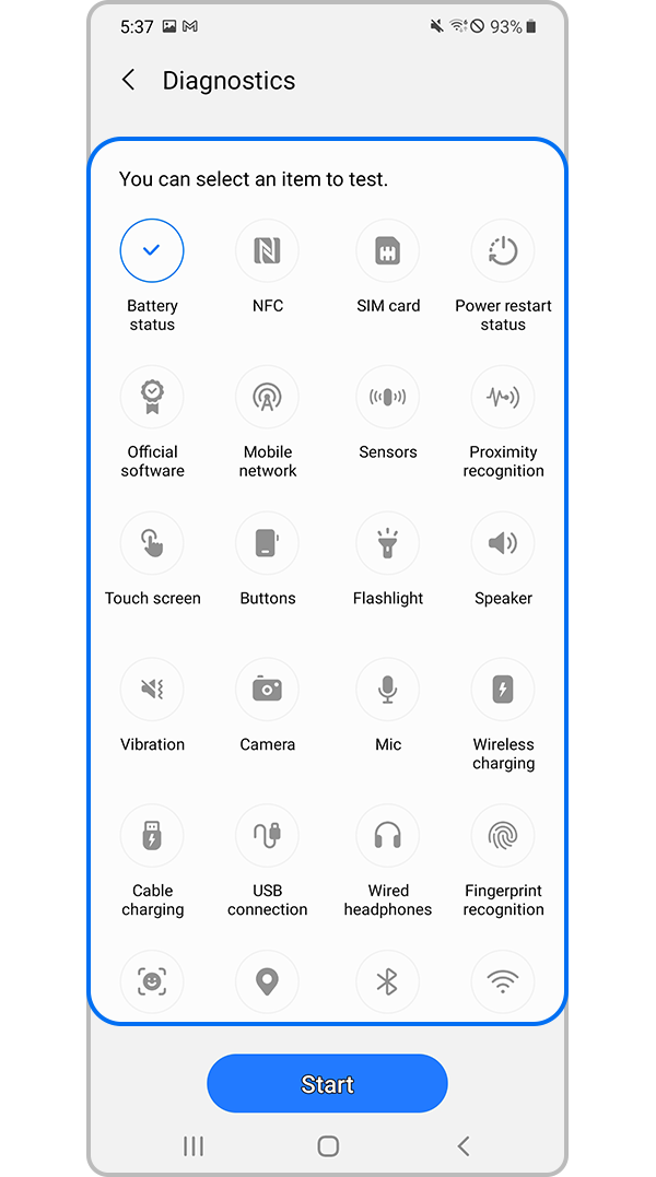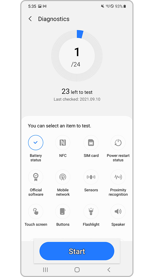 Anda dapat melakukan tes untuk memastikan ponsel Anda berfungsi dengan baik dengan Diagnostik di aplikasi Samsung Members. Ikuti langkah-langkah di bawah ini untuk menjalankan Diagnostik melalui Samsung Members.
