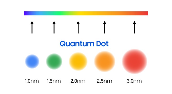 Jadi, apa itu Quantum Dot? Quantum Dots adalah bahan semikonduktor ultra-halus berukuran nano. Titik-titik kecil ini menghasilkan warna cahaya yang berbeda tergantung pada ukuran partikelnya — partikel yang lebih besar memancarkan warna merah sementara partikel yang lebih kecil memancarkan warna biru. Mereka memancarkan cahaya berwarna yang tepat karena ukuran partikelnya menyesuaikan pada kecepatan tingkat kuantum, menghasilkan emisi cahaya yang akurat dan efisien. Hasilnya? Peningkatan kecerahan dan warna yang luar biasa.